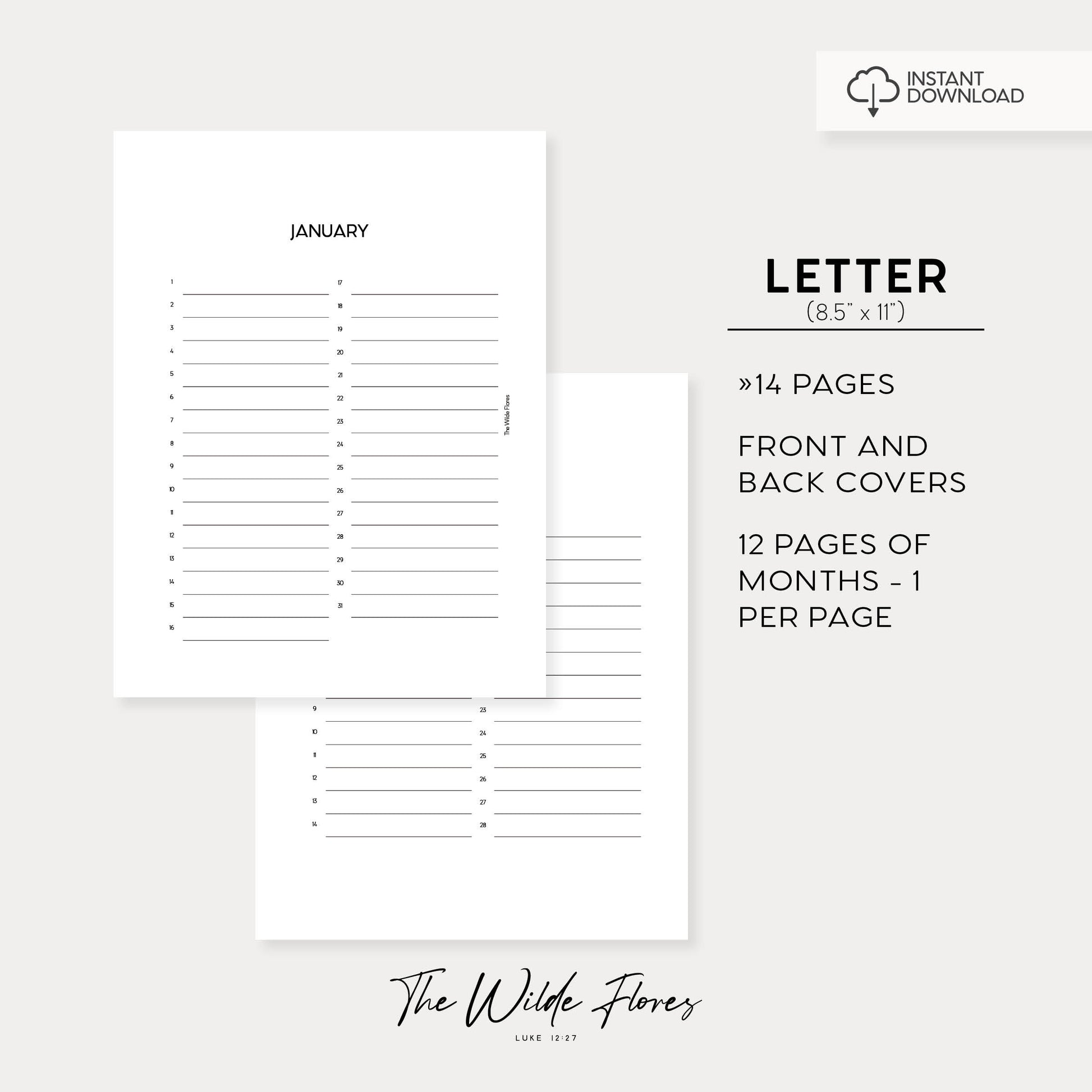 - 12 pages of months: 1 per page